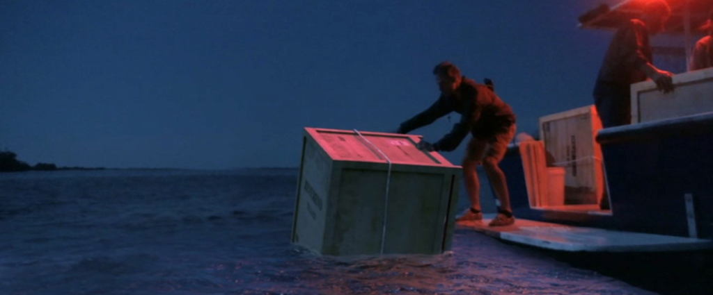 命拾いしたジャレスは、逆にジアを利用するために銃を取り出して正体を明かし、ジアに撒き餌をさせてサメの注意を惹きつけさせている間に木箱を回収する作戦に出ます。