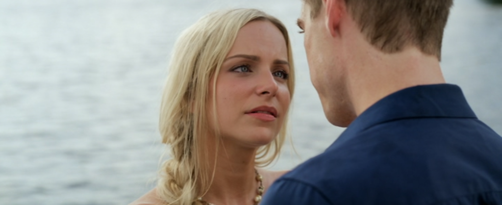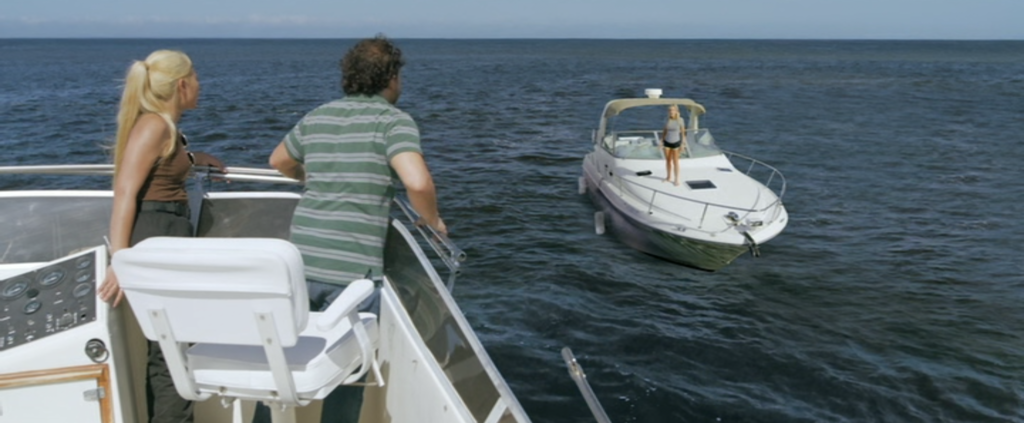 で、物語はそこから5年前へと遡り、近隣の浜辺で新婚を祝い、夫が購入した豪華ヨットでハネムーンクルーズへと繰り出すカップルが登場します。