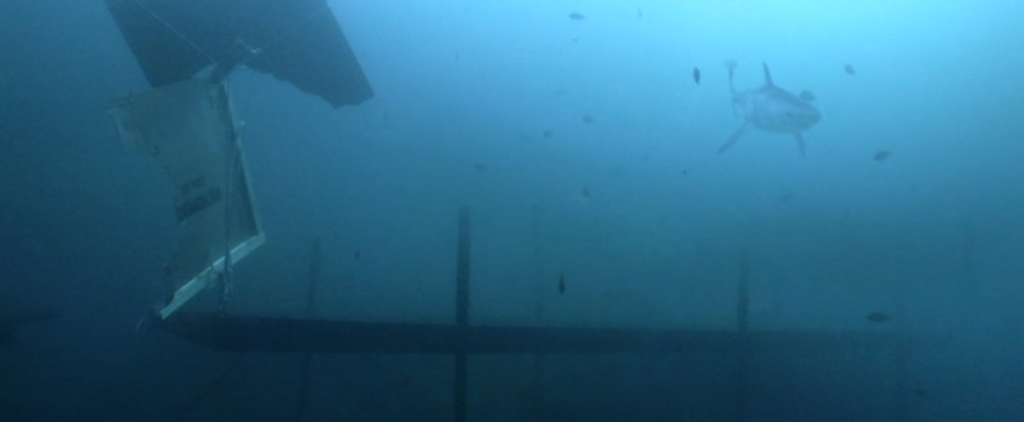 謎の集団が深夜、海底へとダイブしますが、何匹ものどう猛なサメに襲われて全滅するシーンから始まります。