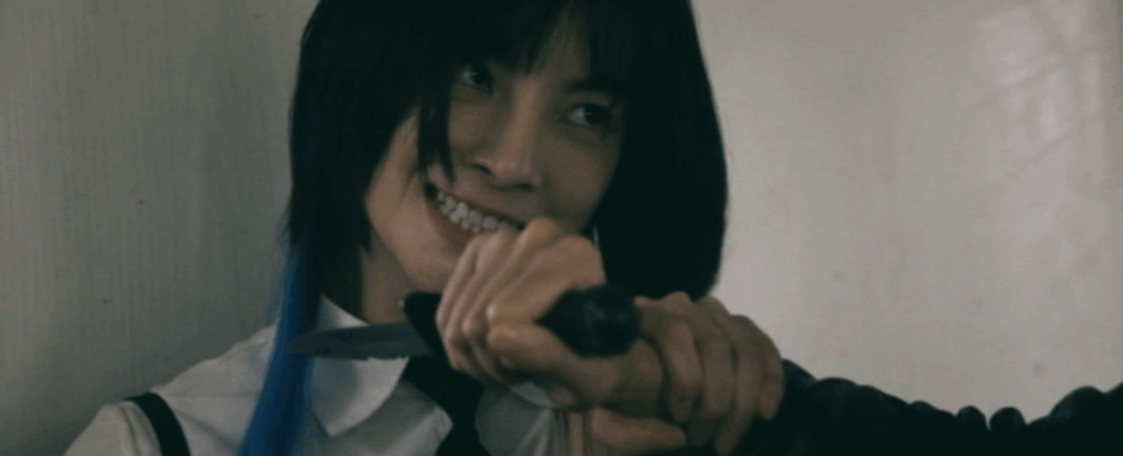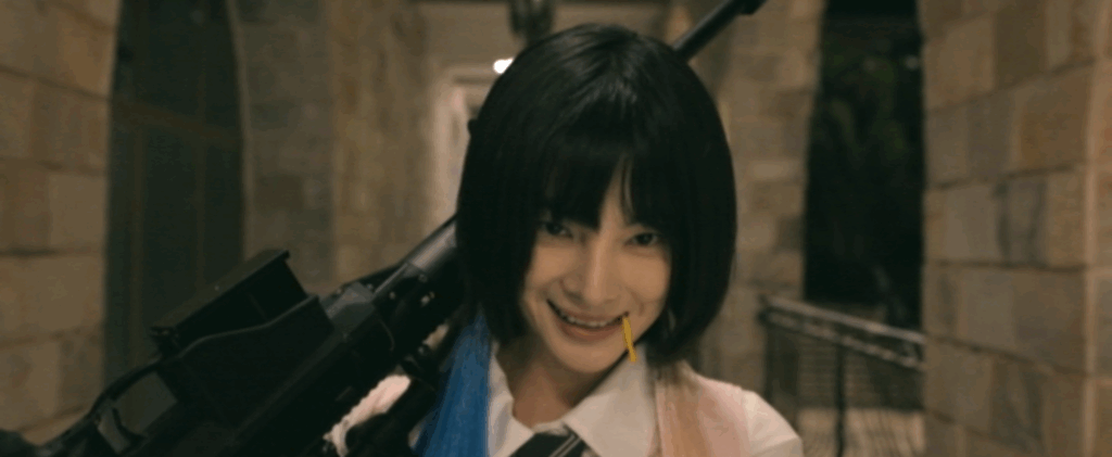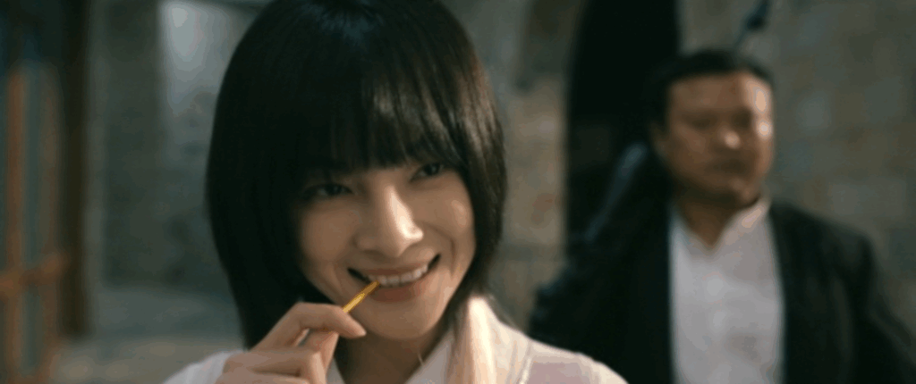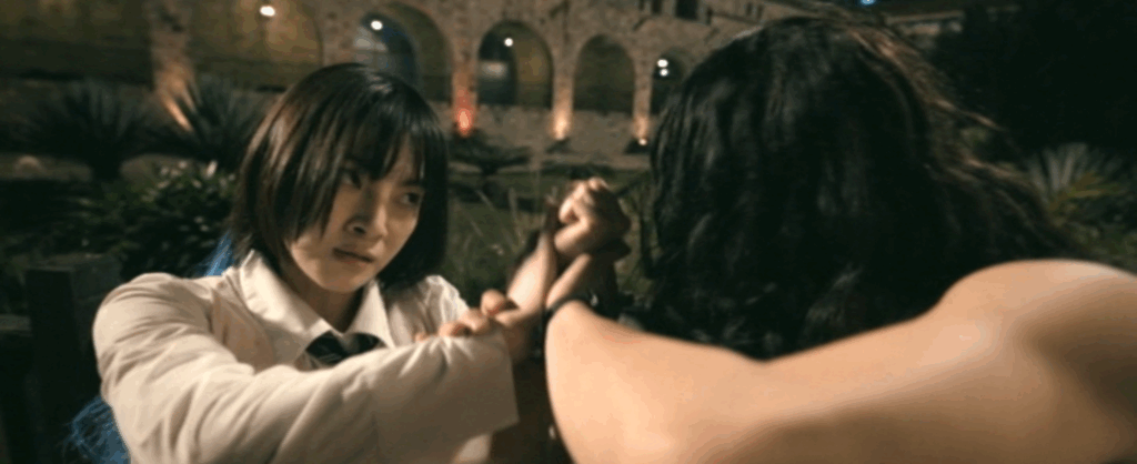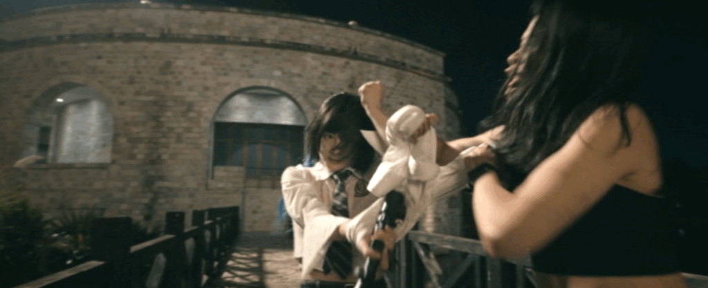 格闘系がそれほど得意では無さそうな制服女子役のヤン・シンも、制服衣装と棒付きの飴ちゃんを舐めてニコリと笑うというハッタリ感強めのキャラと、