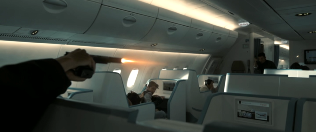緊張感が走るファーストクラスですが、あたふたしている周りの乗客やCAの間隙を突くように、その酒飲みと、その仲間たちが銃器を取り出してあっという間にハイジャックされてしまいます。