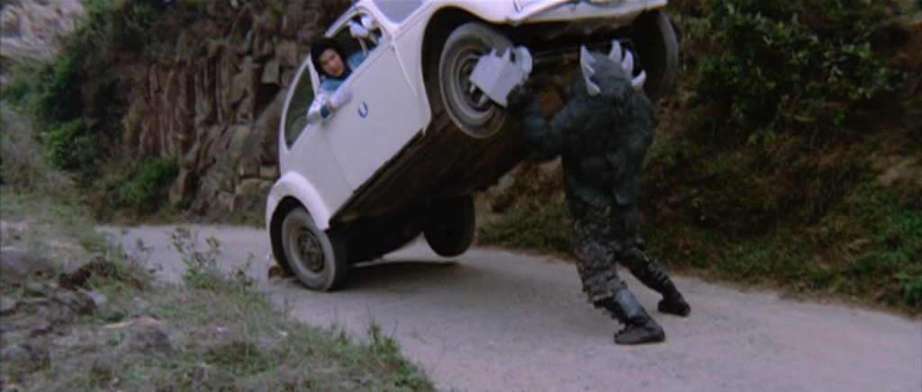 怪人ドリラーは、科学研究所の隊員であるミンがドライブ中の車を、正面から正々堂々と襲い、走行中の車を持ち上げてひっくり返す、