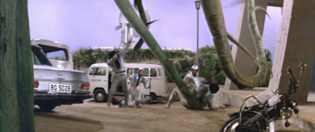 一方怪人プランターの方は、直接科学研究所へと向かい、研究所の建物のコンクリート内に潜り込んで巨大化して研究所を建物ごと豪快に襲います。