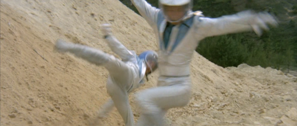 そのまま屋外へと逃走、バイクチェイスへと発展していきます。