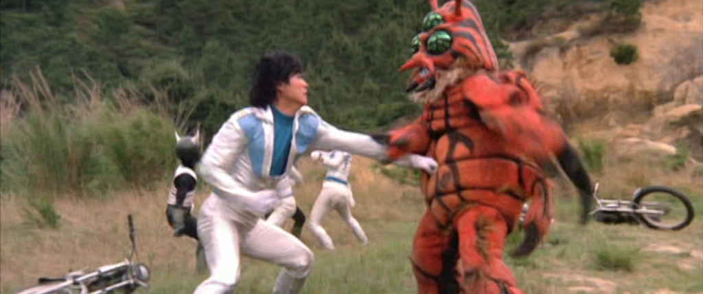 しかし、異変を察知した人間レイ・マ(だけノーヘル)と部下の隊員達もバイクで山の広場へと繰り出して、