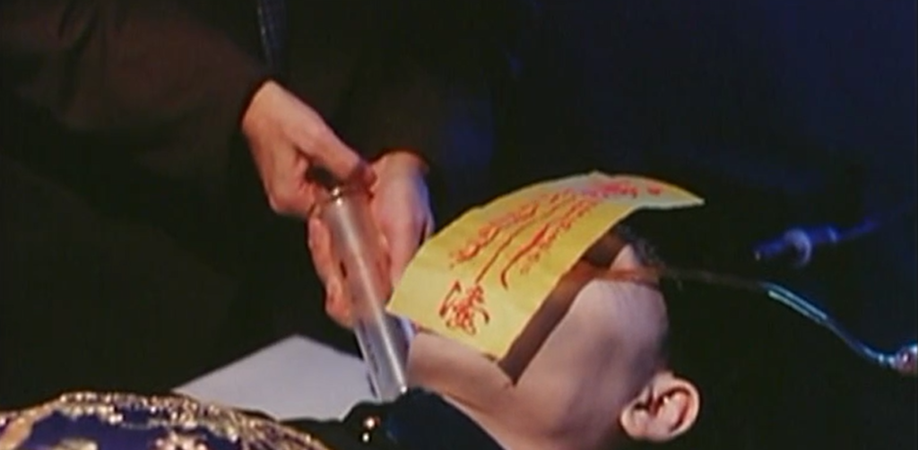 術を駆使してキョンシーを制圧しようとしますが、興奮剤の影響によってお札も効かなくなっている状態に、一時撤退を余儀なくされます。